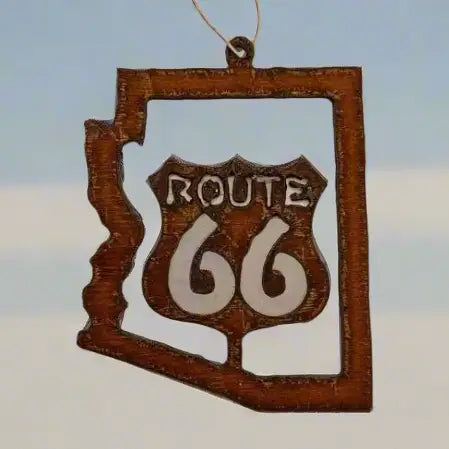 Celebrate iconic Route 66 with this handcrafted steel ornament featuring Arizona's silhouette and the legendary highway cutout. Individually rusted by Universal Ironworks Inc. in Prescott, Arizona, each piece is uniquely weathered for authentic character. A perfect keepsake for Route 66 lovers and Arizona natives alike, this American-made ornament brings vintage Americana charm to any collection.